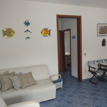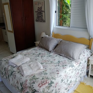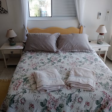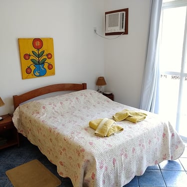 Dispõe de dois quartos, sendo uma Suíte de casal, acomodando até 5 pessoas, além de extensa sacada com churrasqueira, com vista para o exuberante morro de Cachoeira.